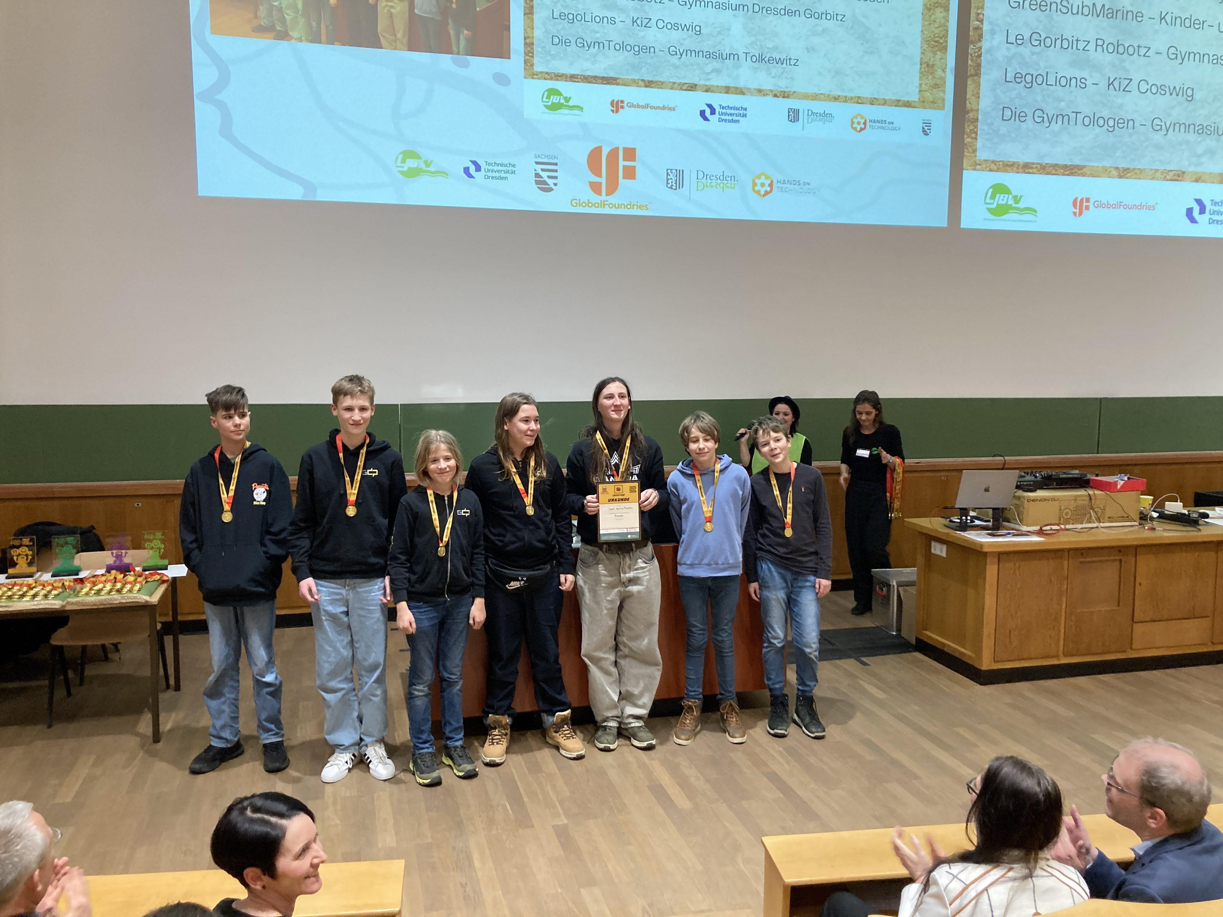 Die Schüler*innen bereiteten sich gut auf die First Lego League Challenge vor, untersuchten die technischen Fortschritte und globalen Herausforderungen und übten mit dem gebauten Roboter das Lösen vieler verschiedener Aufgaben. In dieser Saison drehte sich alles um das Thema „Cargo connect“. Am 26.03.2022 war es dann auch schon so weit und der Regionalwettbewerb fand im Hörsaal von der TU Dresden statt. Dort stellte unser Team GDP Magenta Mindstorms sein ausgearbeitetes spannendes Forschungsprojekt sowie einen durch die Schüler*innen gebauten und programmierten Roboter der Wettbewerbsjury vor.